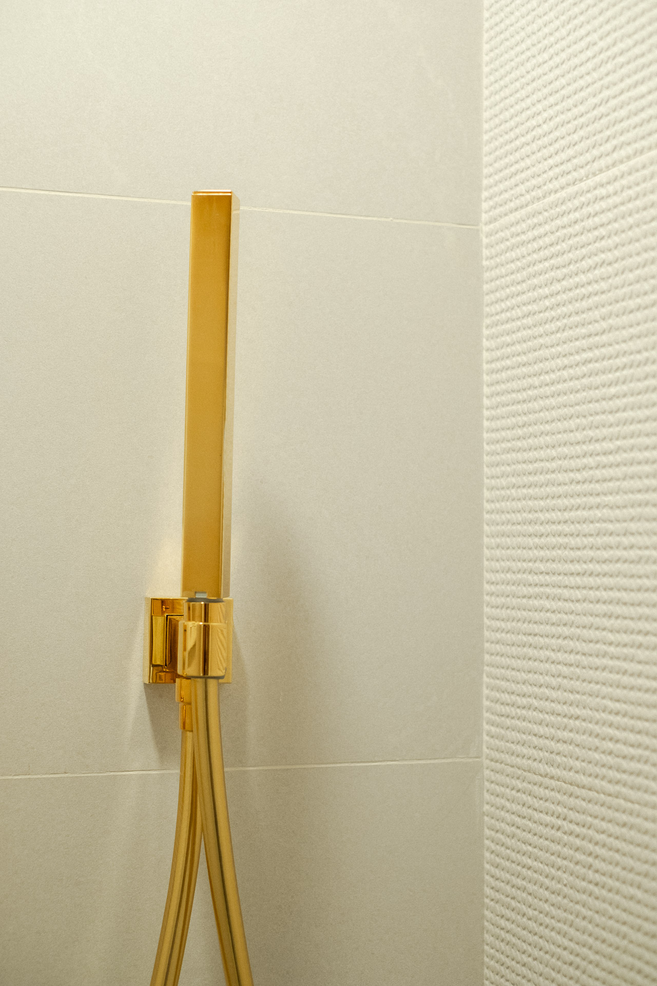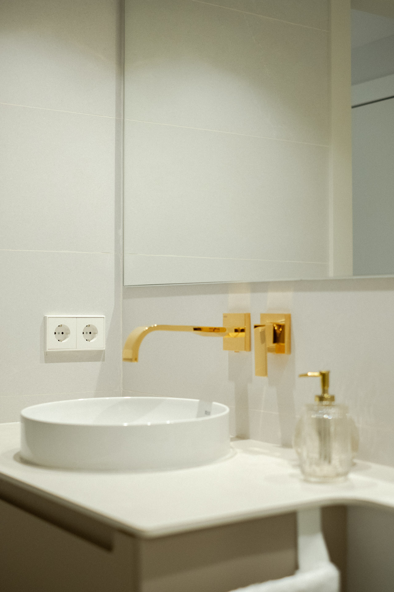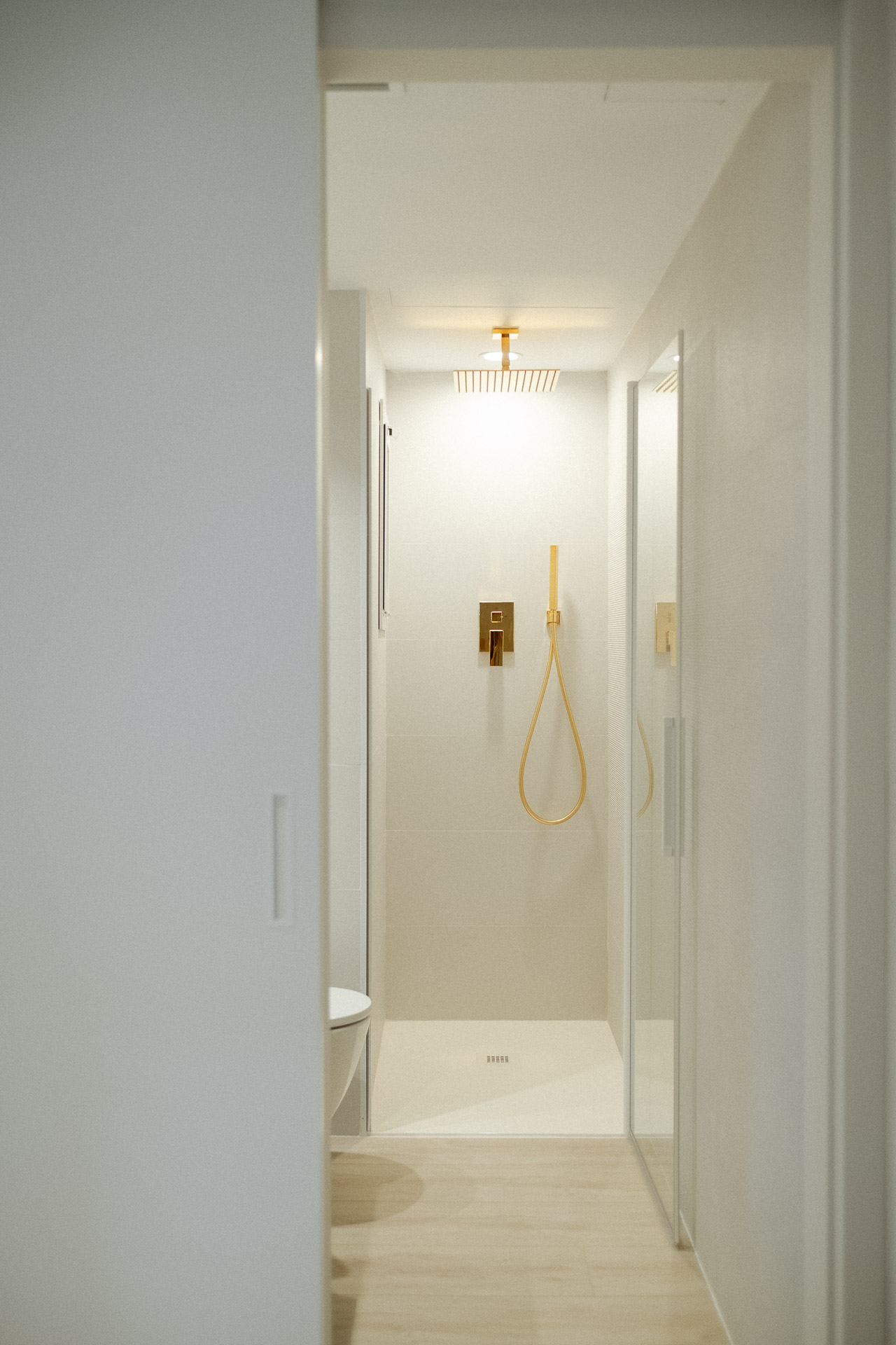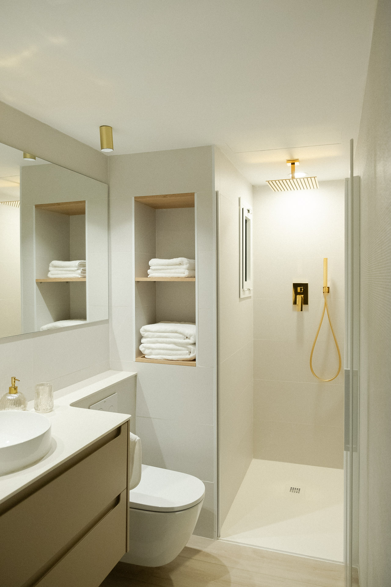 El diseño se resuelve mediante una paleta de distintos tonos de blanco, combinados con texturas elegantes y griferías empotradas de alta calidad en acabado dorado. Una superficie de mármol en forma de repisa conecta el mueble de baño con el sanitario, aportando continuidad y ligereza visual. Apliques decorativos y un gran espejo completan el conjunto, potenciando la luminosidad del espacio.